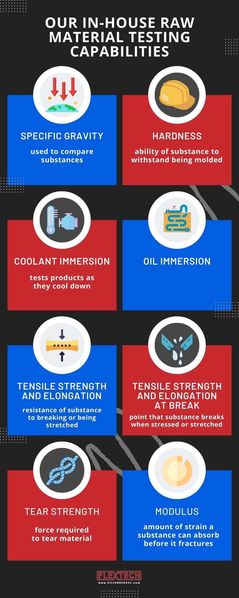 Here at Flex Technologies, we believe in providing the best for our customers. Therefore, not only do we provide the best flexible silicone tubing and hoses for use in your applications, but we also offer in-house raw material testing so that you can both rest assured knowing the capabilities of the silicone tubing you are getting from us and so that you can test your own tubing right here. Below, we'll take a look at our in-house raw material testing capabilities. Shop our selection today!